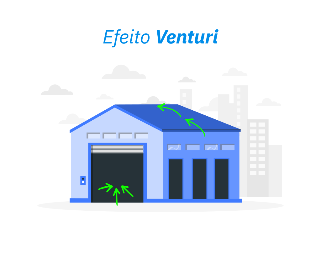 O efeito Venturi está relacionado à variação de pressão causada pela velocidade do vento. Quando o vento passa por uma abertura estrategicamente posicionada, forma-se uma zona de baixa pressão que favorece a extração do ar interno.