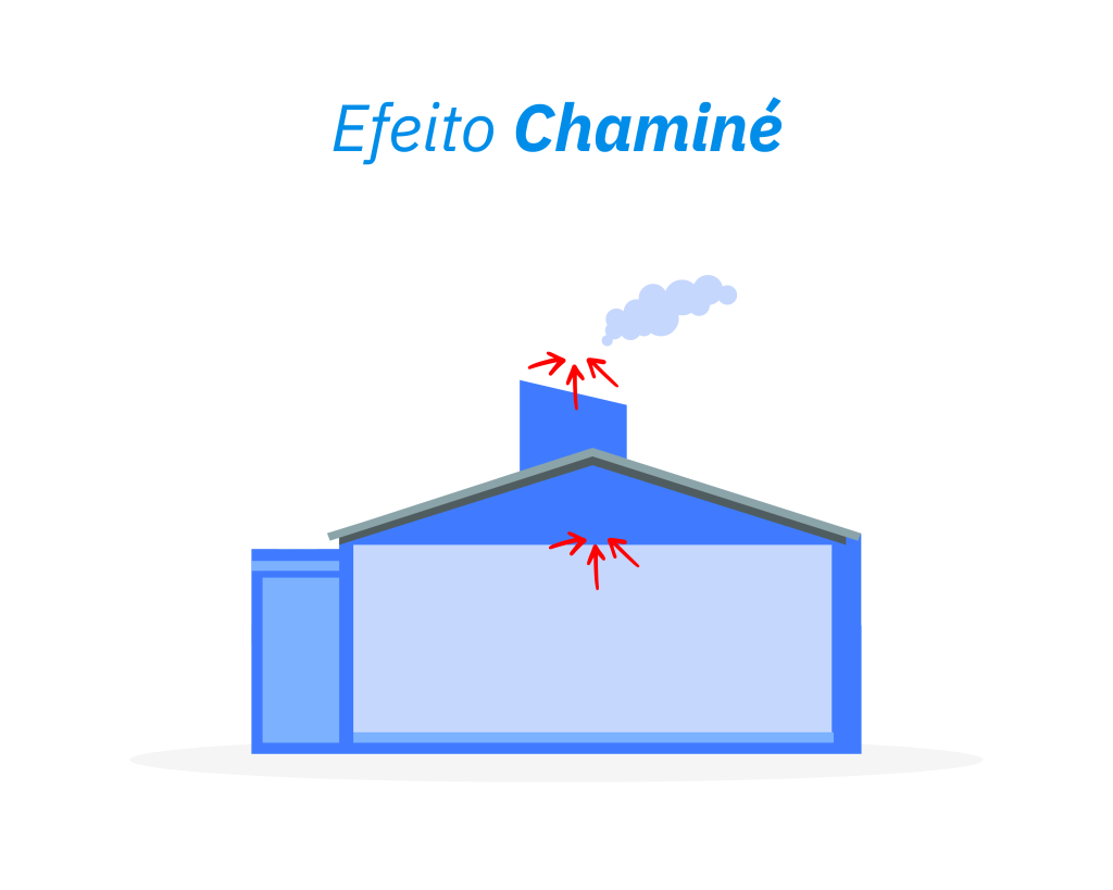 O efeito chaminé ocorre devido à diferença de densidade entre o ar quente e o ar frio. Como o ar aquecido é mais leve, ele tende a subir e se acumular nas partes mais altas da edificação.